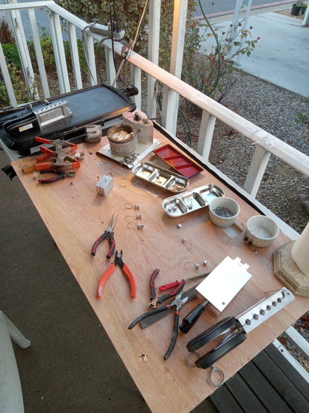 Just a redneck on the porch of his double-wide...makin' jigheads...one pink flamingo short of a country song....