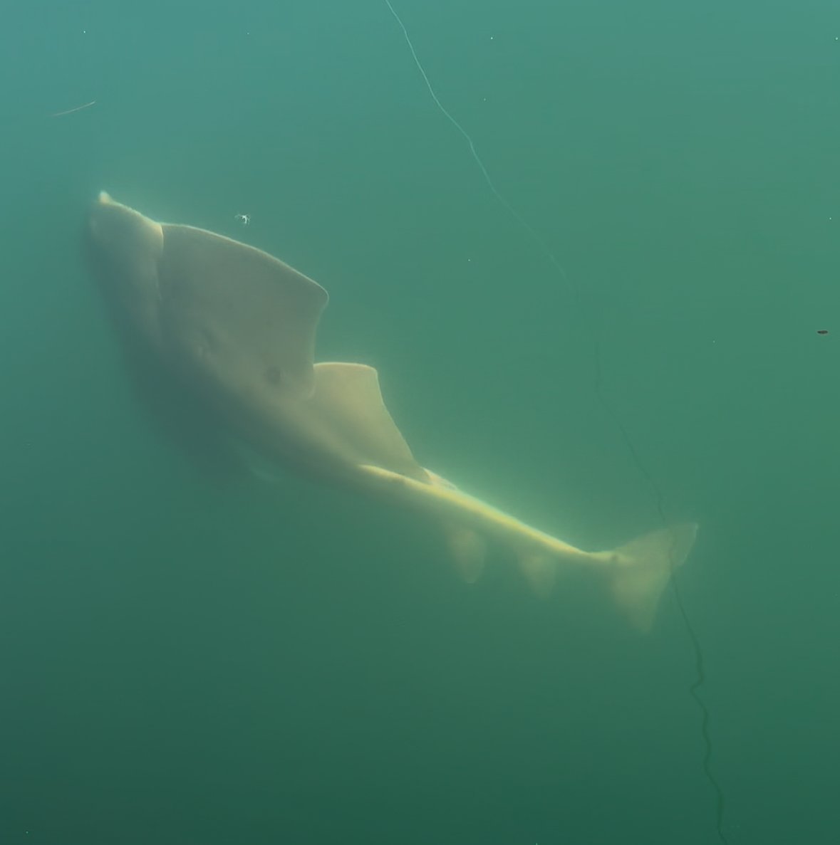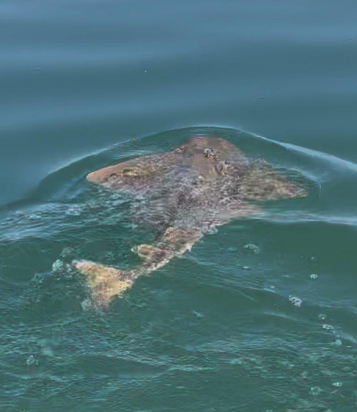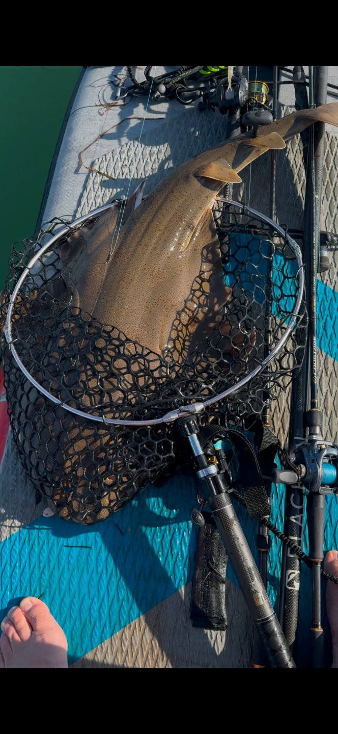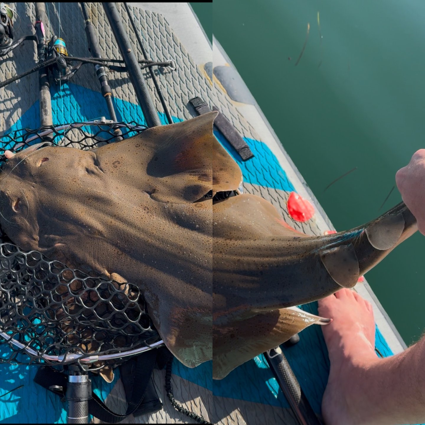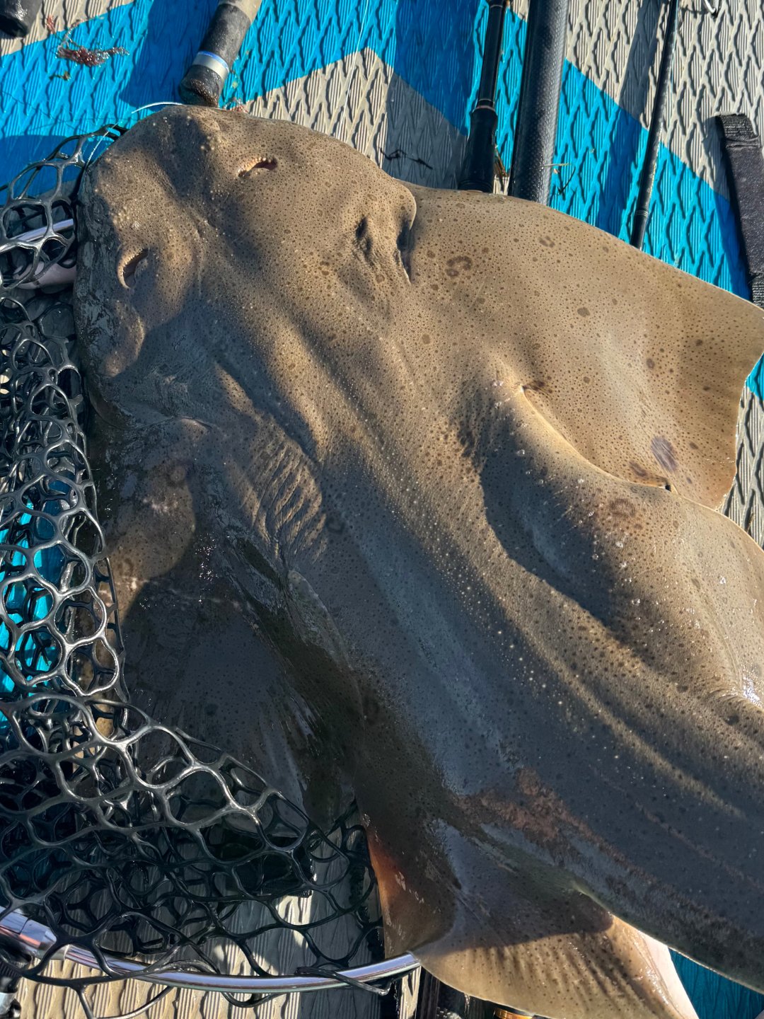 After a few minutes, I got color - brown on top, white on bottom, it's a halibu-oh dang it's an angel shark!! never caught one before and was thrilled to have one on the end of the line. thankfully my net was just wide enough to get his head into. he was surprisingly calm as I brought him on the board, but with a fish of that size on a paddleboard, even minor thrashing can mean chaos, so I quickly got some pictures and video, pulled the tube bait out of his upper lip, and let him swim off. no way to measure him on the board but at least 40 inches or so. and he was heavy lol.