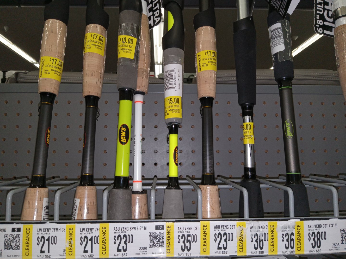 There are a couple dozen different Lew's rods including spinning rods that are marked down. Can you find 'em at your local Walmart? Probably not...but if you're close to the Santee store and need a backup rod, or one for the kids...or just something lighter than the "I love the action of this old fiberglass rod but dayumm my tennis elbow is killing me" favorite...might be worth a look.