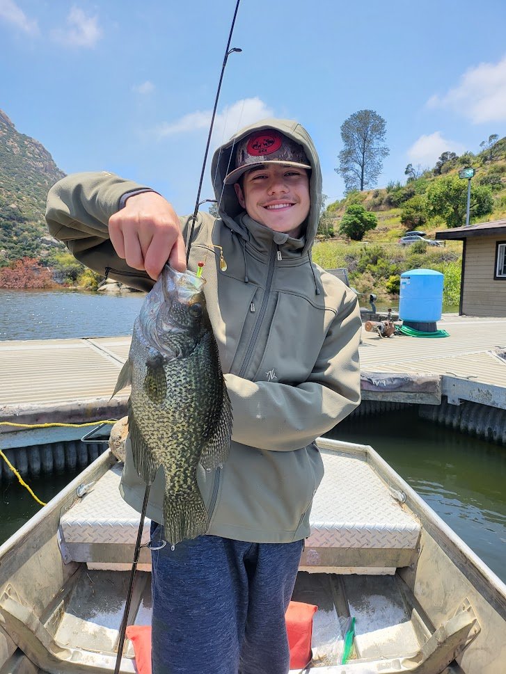 We needed to be back home before 3:30 so we headed toward the dock around 1 PM. While I started packing things up I told him to fish around with the beetle spin. Sure enough they were ready to play. He immediately started catching crappie and added a few bass along the way. As I was walking back onto the dock for the last load of stuff my son had a funny look on his face so I asked him if he had just caught another nice one...he sheepishly grinned and looked down to where I could see water dripping from his entire outfit. In his excited state of catching fish on every other drop he had walked backwards off the dock