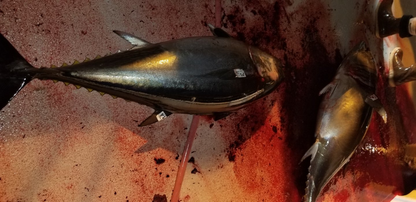 We did it!! All previous fish counts were filled with small blue fin to 15 pounds! We thought we'd be fishing the same......but the big ones showed up in force. Made it to the grounds on our 1st day at about 9 pm and on our first drop we landed 3 over 80 pounds. Then we picked em up throughout the night with fish to 200 pounds. The night ended at 530 am. Took a nap and back on the rail at 7 am for fly lined madness on blue fin up to 100 pounds! At times had up to 8 fish hanging! Limited out by 10 am. What next? Rock fish!