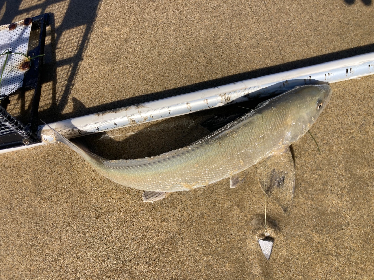 This late season corbina ate a crab right at the edge of the sandy brown water. Good news is they are still around.