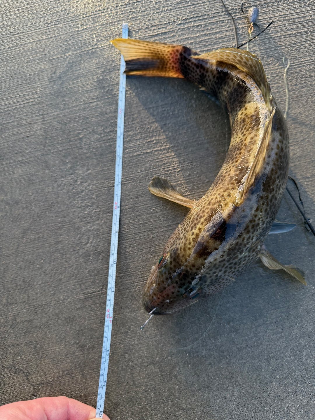 Headed out to Shelter Island around 630 for what turned into a gorgeous morning on the water. The tide was super high and not even at it's projected highest at 9ish, you can see from the point by the Bali Hai. I wasn't having much luck at my usual spots, some hits but no pins. I decided to try somewhere I've never tried, the Shelter Island launch ramp. It wasn't busy so I walked out on the right side of the launch and started tossing a dropshot Gulp Minnow, and basically just letting the current move it along, thinking I might finally pick up that elusive keeper halibut. I noticed my line moving faster than normal so I set it and it was on! It felt so heavy I thought I might have actually gotten that hali, so I started walking it back towards the beach just in case, I was actually shaking with anticipation. When it got shallow I saw it was actually a toad of a Spotty! Perfect hookset in the upper lip. He wouldn't hold still for a measure pic, but he was 15". My PB for the new year! I ended up getting a mackerel after that, that I tried to turn into something bigger, but that spotty was the fish of that day. Hope everyone has a great 2026!