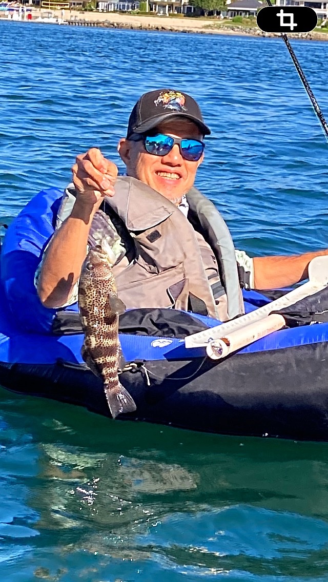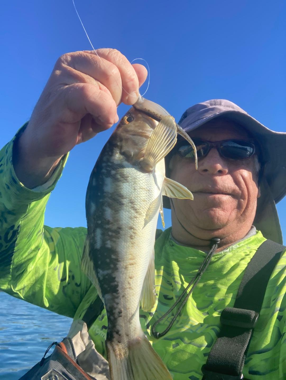 Went to the Harbor for a Float Tube Session with my Buddy Ian. I have 63 years on this Harbor and have it mostly figured out. If I say they are hitting 5 inch ZMan Streakz in Mud Minnow, on a 1/4 oz Jighead and I have some if you need one, you should prolly take it. He wanted a Halibut. In early January. I figured we were lucky to get a bite much less a few Bass flipping the docks. So Ian started fishing with a Drop Shot and a small Pearl Fluke and I got in the water with my Jig. I got hit on the First cast and my first Fish for 2026 was a Calico Bass. Not a monster by any means but it was the First of the Year for me. After that I landed 8 nice Spotted Bay Bass including two that were over 16 inches and fought like Fish twice their size. I fished inside and out in the Channel, but the fish were tight to pilings and seemed to hit the Jig after a lift and let fall to the bottom. Sometime I let it sit for 10 seconds before a hit. Ian followed up with Two Spotties if his own, but neither of us got an Early season Halibut The Santa Ana Wind picked up and blew us off the water after about 2 hours. It was in the forcast but we went out anyway, just in case it wouldn’t be fierce. It was, and started blowing the tops off the whitecaps in the Bay, blowing spray on my glasses a few times. We got off the water and had a quick coupon Lunch at Dell Taco, nothing better than after Tube lunch at 2/1 prices! All that kicking certainly leaves you calorie deficient.