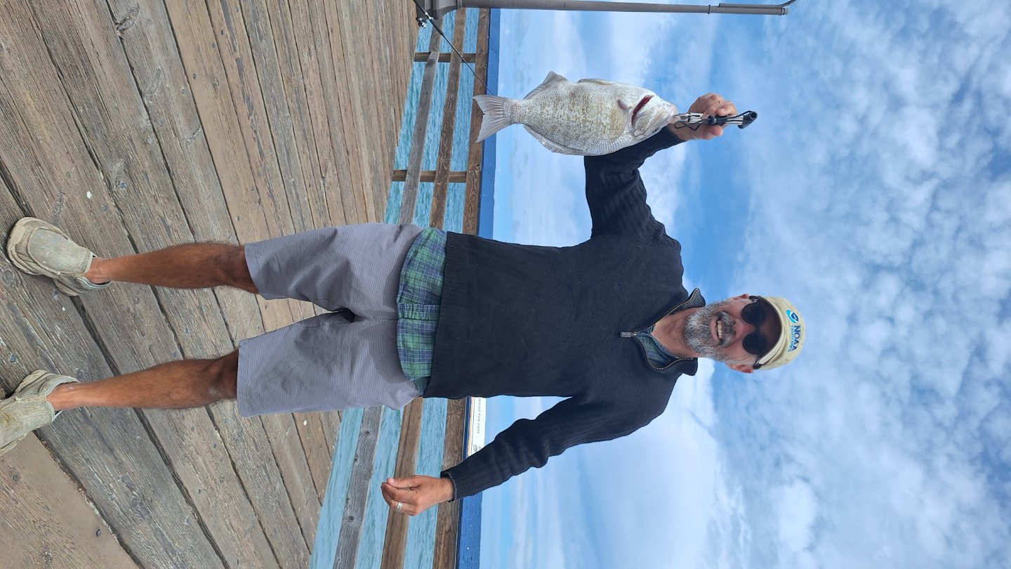 I was entertaining myself on the I.B. pier when I saw 'Francisco' reel in the biggest BSP I have personally seen. He had 2 others in this size range in his bucket. I made such a big deal out of it that he insisted I pose with *his* fish for a photo! Since I didn't ask permission to use his face on the forum, you get me.