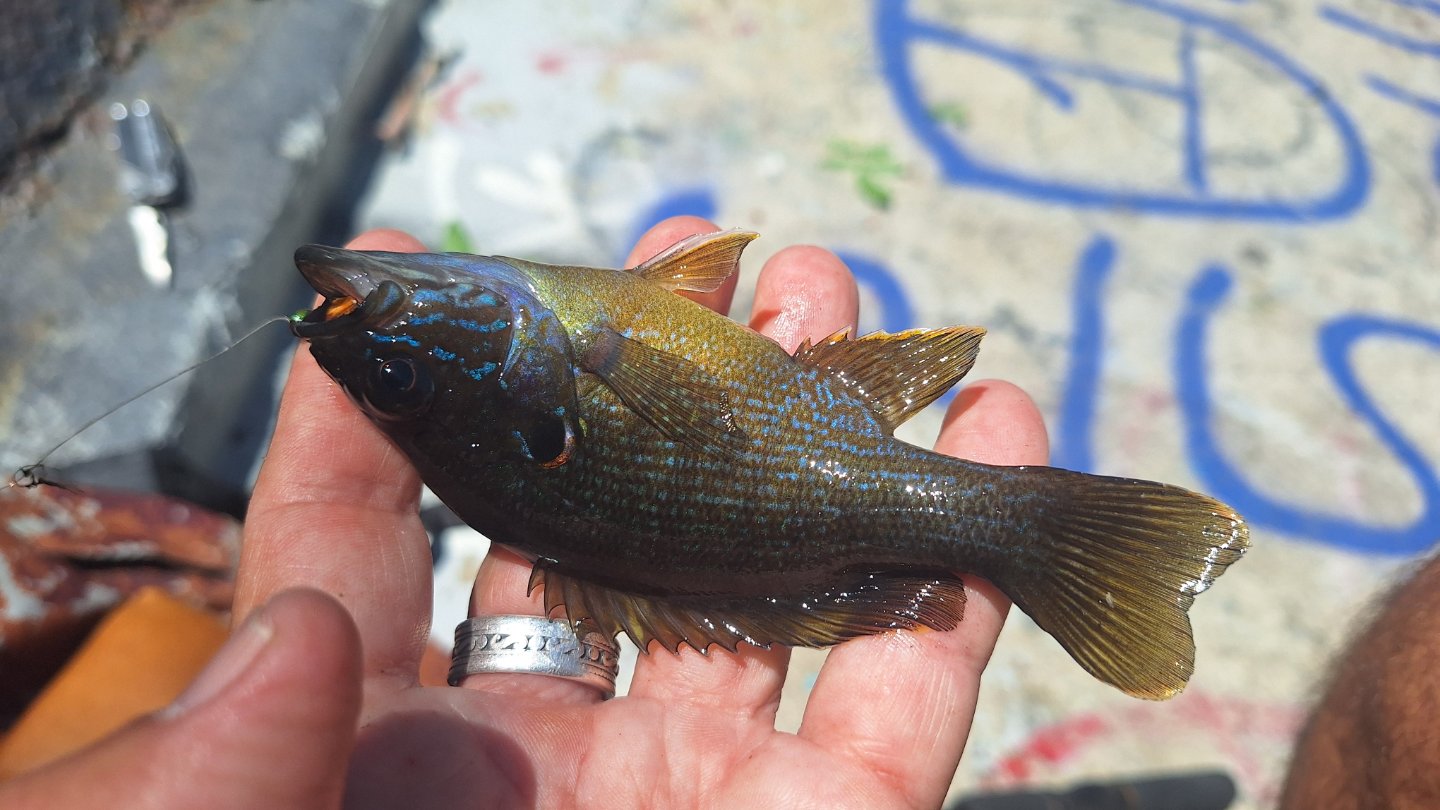 Snagged and lost it, but not before I fooled 3 green sunfish with it! Size 8 mosquito hook, thrift store bead, black shrink tubing, and wing feather material from a red-shafted flicker. Sinking fly. Used some floating twigs as casting weight & strike indicators 2 ft above the fly with my spinning rod. Fish all hit on the slow twitch retrieve.