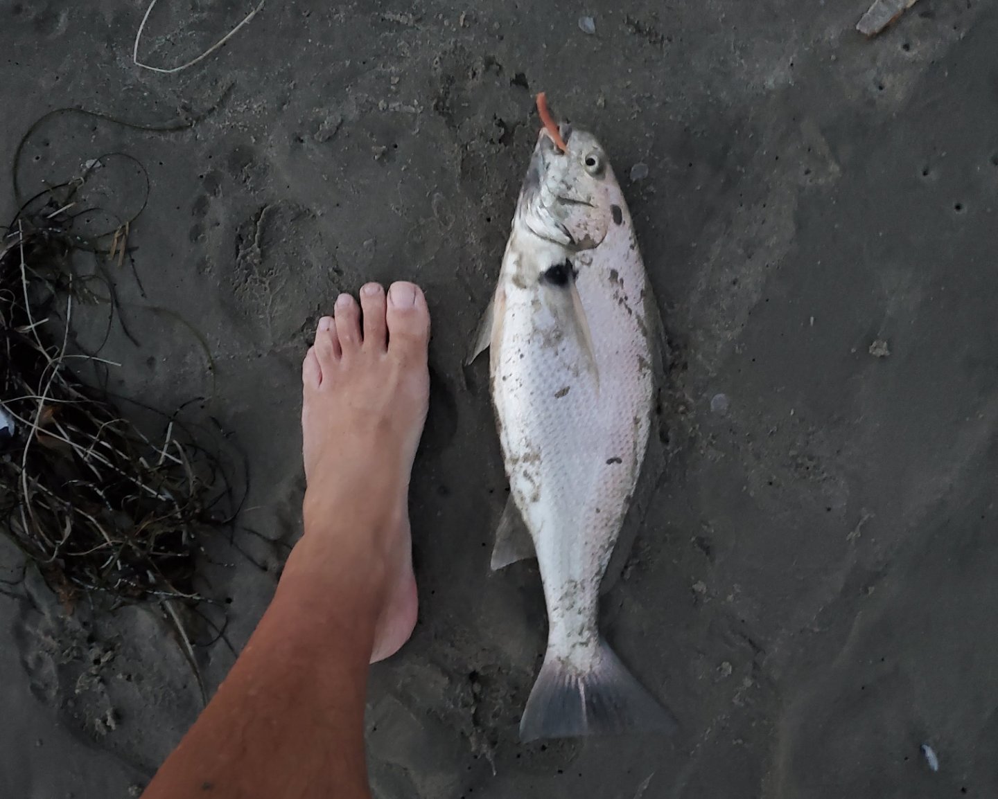 There has been a strong bite in the surf with perch, croaker, and a few small corbina. Then, right at dark got a spot fin! was fun on the perch gear. btw, my feet are huge...