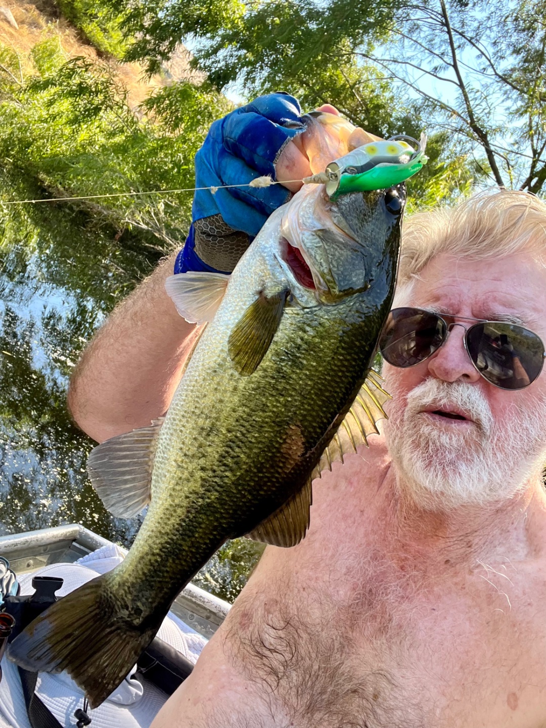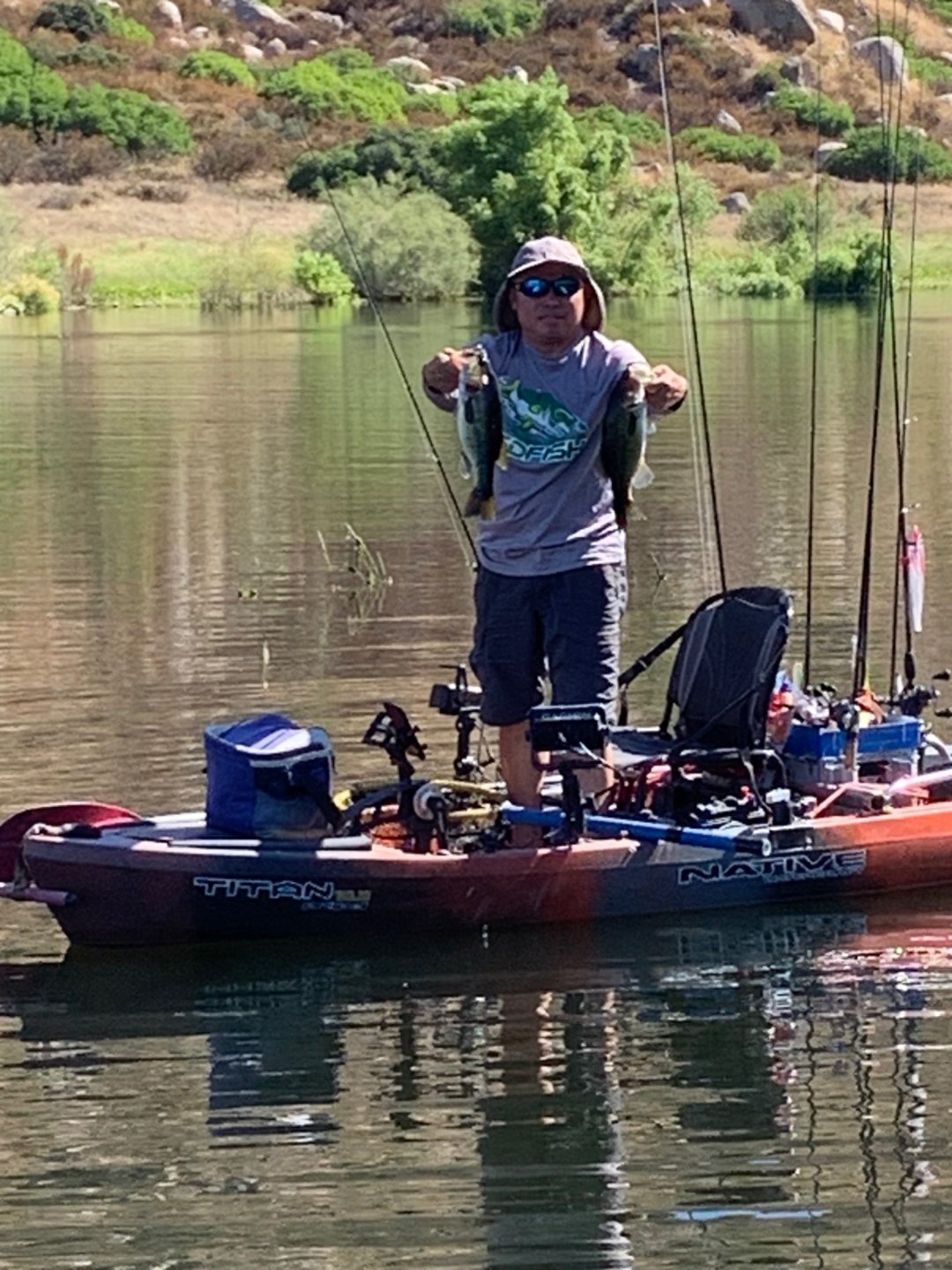 Got there a little later 0530 and took my time getting into the water at 0600. First thing is the water is 4 degrees cooler than it was last week. The temp ranged from 75.1F to 78.7F for the day. I think that slowed down the bite a bit. Checked around Hauser and had some boils by the Island top in Hauser, but no matter what I threw, they weren't interested in it. It was single fish and they'd surface, but they weren't chasing bait, or if they were, it was bait I couldn't see. Worked shoreline all around Hauser and the tally was 2 popper bass, and 9 jerkbait bass. Met up with Chuck in the back of Hauser and we found some boils. Chuck was fishing a device with two flukes on it and scored a double on one cast. See picture below. That was pretty neat. The boils were a bit more subdued in the back of Hauser, good numbers of fish, but quick and if you weren't right there, you were fishless. I added a few more to total out the day with 15 bass, Chuck had the same. I also got 5 large bluegill on the jerkbait. Chatting with others, the bluegill were all very cooperative for everyone. Didn't get the impression that anyone found large numbers of bass though. Maybe this weekend the heat will bring them back up. Wind was calm most of the morning, came up a bit around noon, but not more than 10kts and mostly around 5kts.